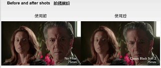 特性:去除難看的瑕疵和皺紋 減少?lài)揽恋囊曨l邊緣,同時(shí)保持豐富的黑色和色彩 高清經(jīng)典柔和黑霜濾鏡的組合