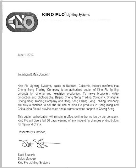 KINO FLO授權書(shū)